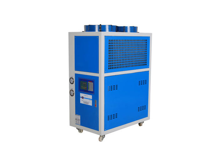 该风冷箱体式冷水机主要由涡旋式压缩机、高效V型翅片冷凝器、过滤器、液路控制阀、热力膨胀阀、内螺纹铜管蒸发器、电气控制系统等组成。